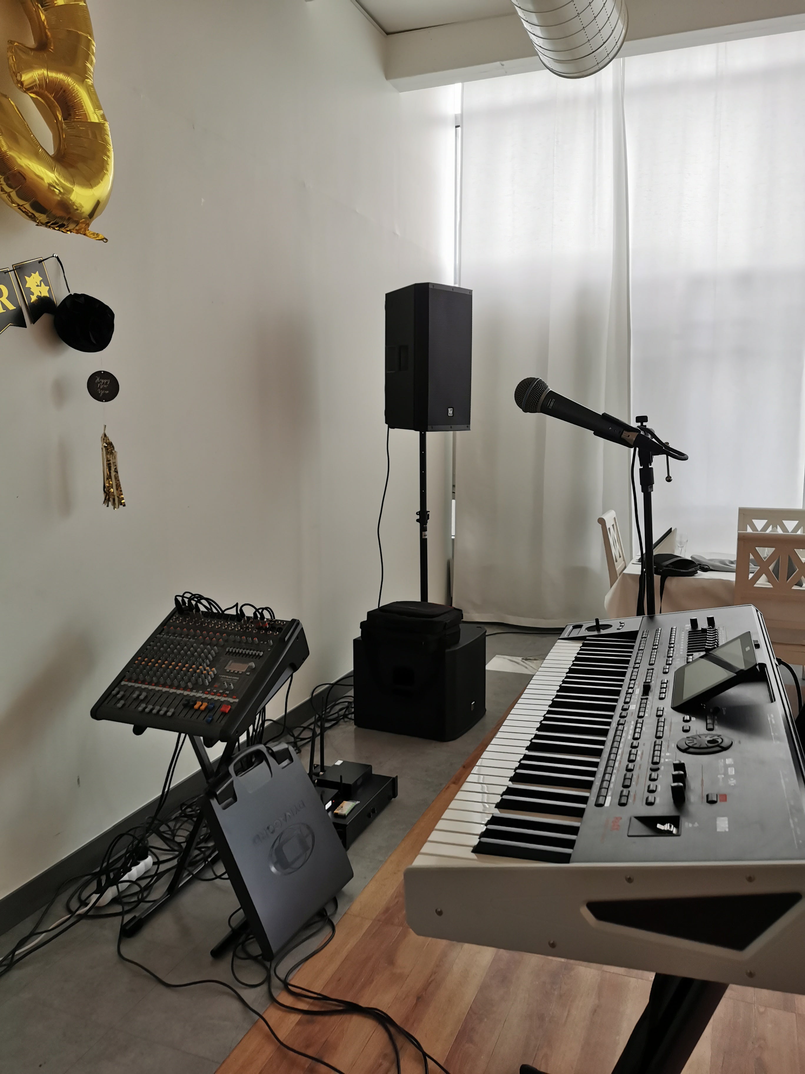 Vi erbjuder ett brett utbud av tillbehör till våra ljudpaket, inklusive mikrofoner, discoljus och mixerbord.