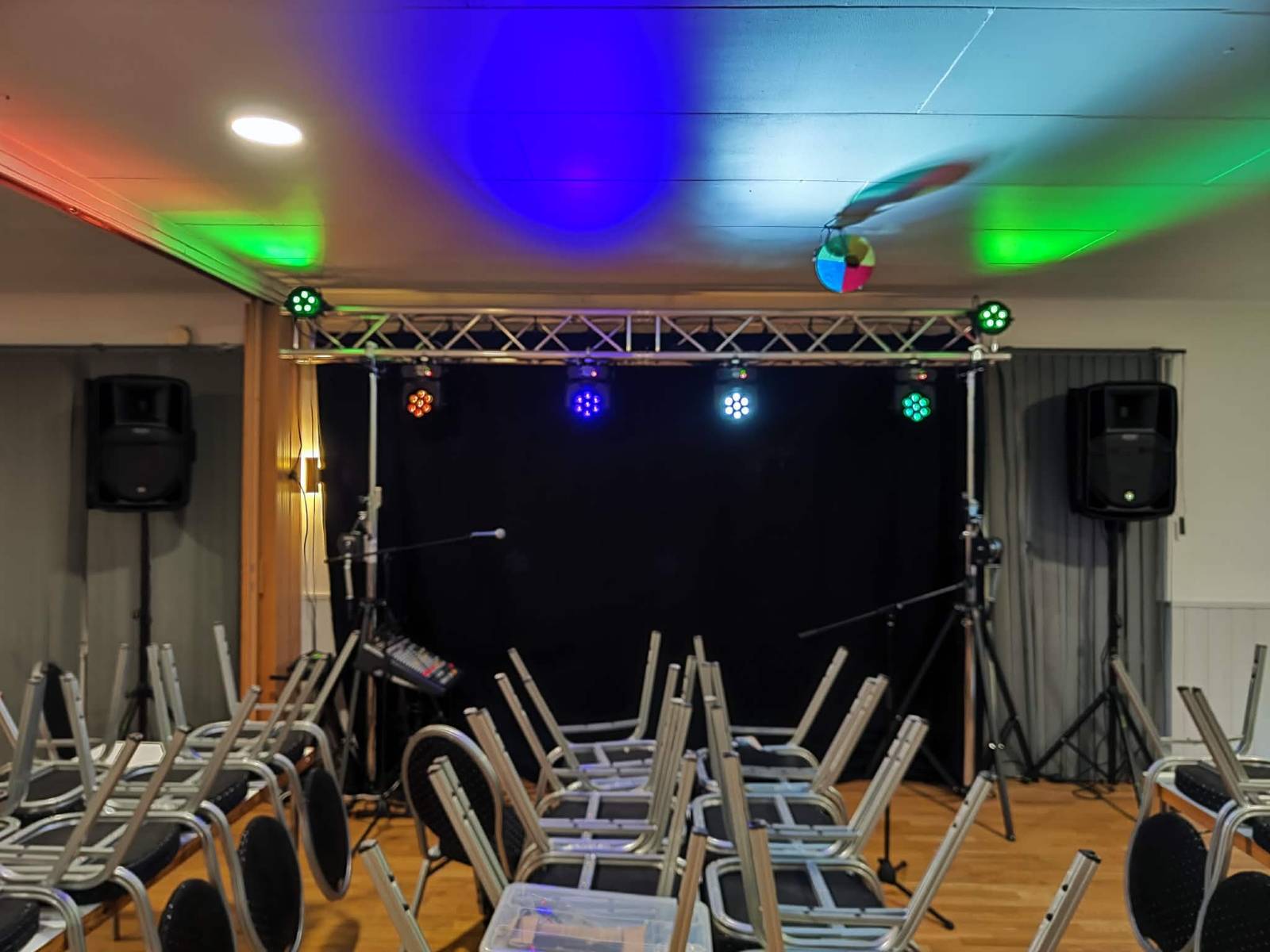Svart backdrop/duk som ger en stilren och professionell inramning av scenen eller dansgolvet.